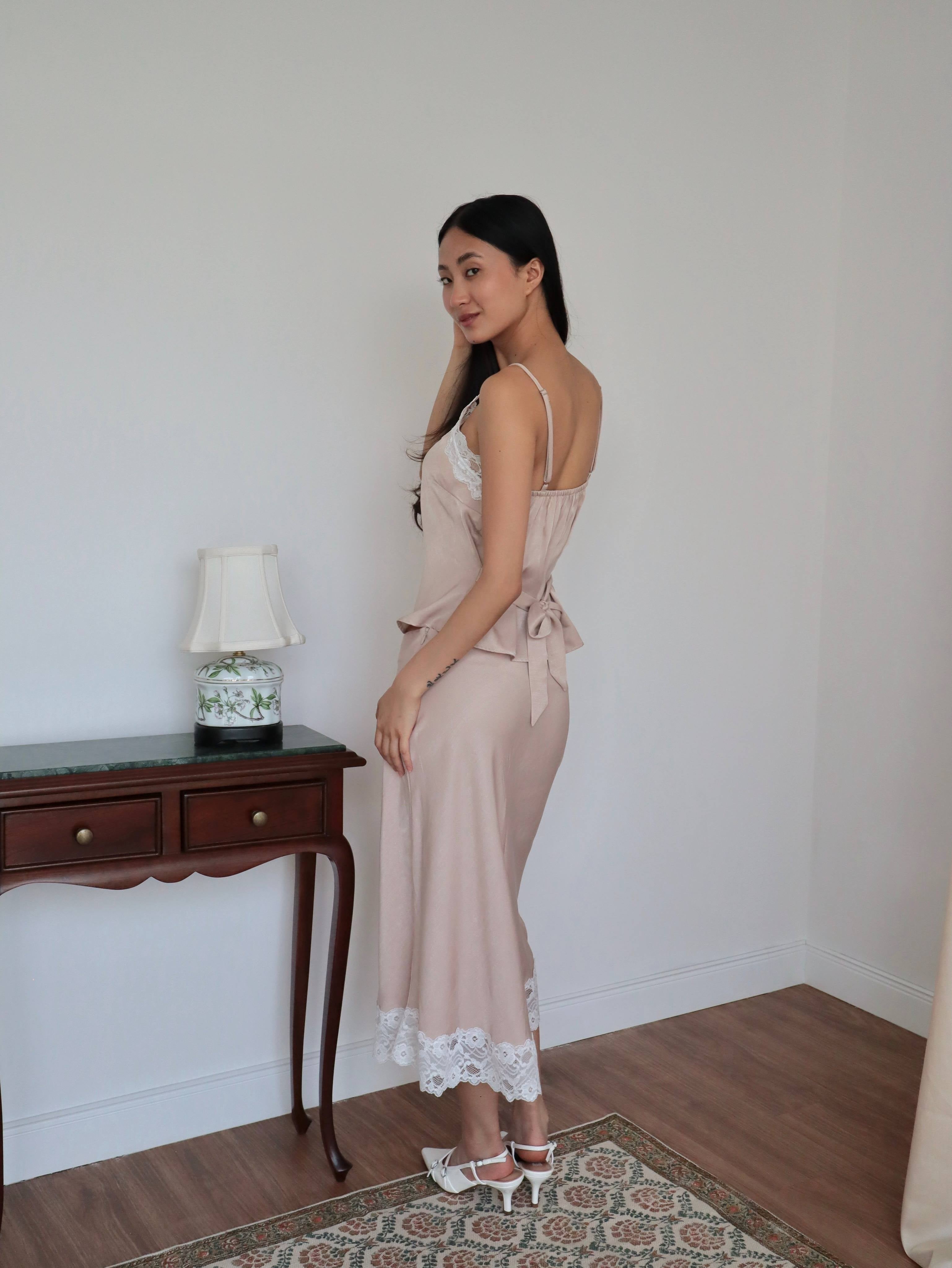 La falda midi estilo sirena, que se asienta debajo de la cintura, está terminada con blonda en toda la basta, creando un acabado elegante y encantador. Un conjunto pensado para ocasiones especiales, lleno de movimiento y un aire súper femenino.